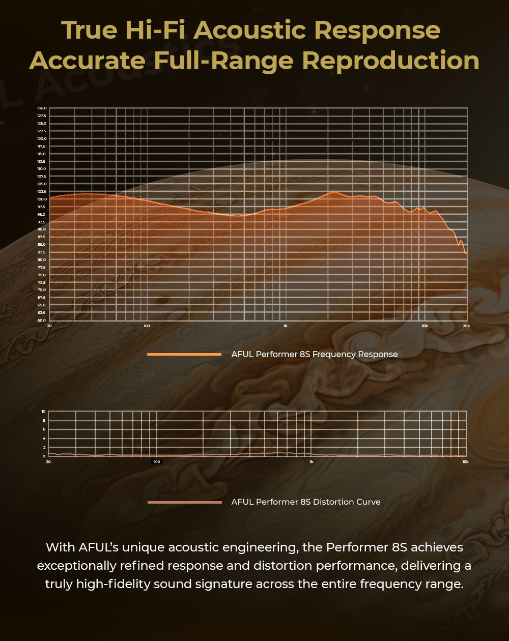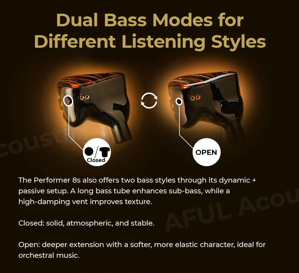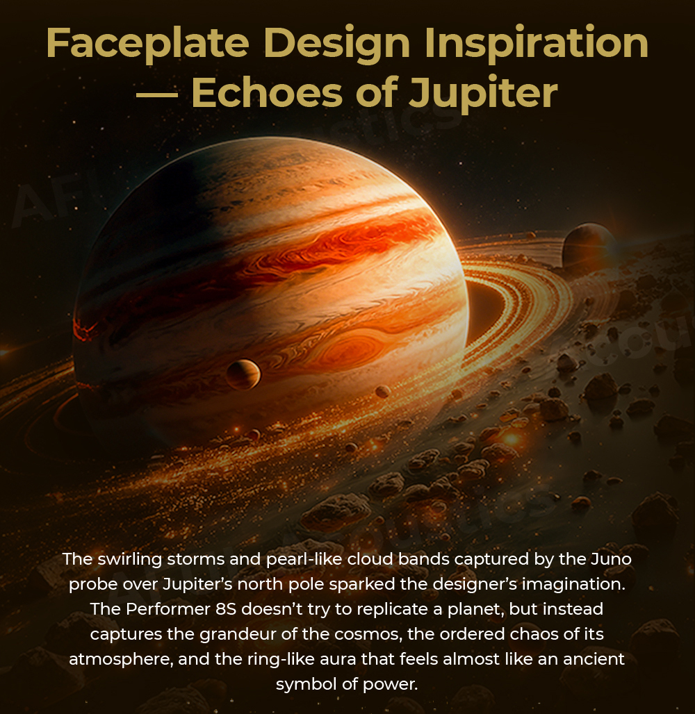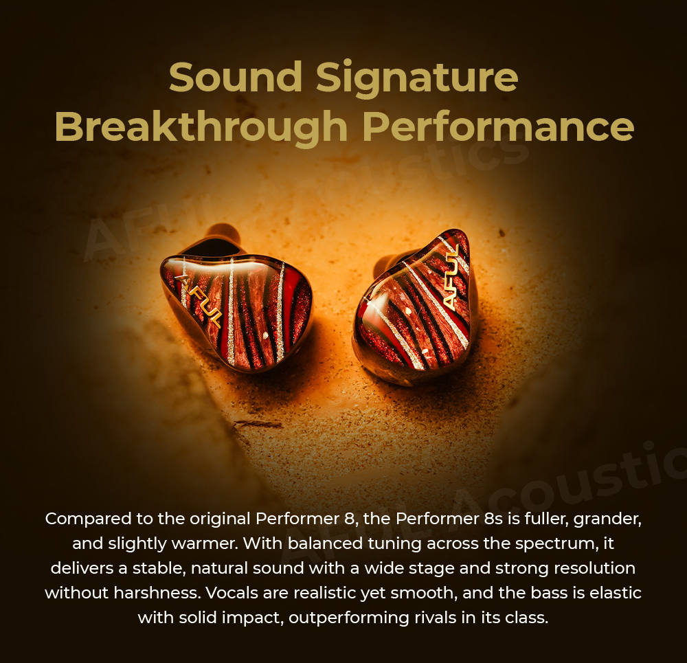 AFUL Performer8S is the new multi-driver hybrid in-ear monitor from the house of AFUL. Designed as an upgrade to the highly-acclaimed Performer 5 and Performer 8, the new Performer 8S brings a complete overhaul with a new quadbrid driver architecture. It houses an astonishing 1DD, 6BA, 1 Passive Radiator, and 1 Micro Planar magnetic driver setup on each side. Inspired by the “Echoes of Jupiter” the Performer 8S has a stunning visual appeal with classy face panels. The Performer 8S combines its sophisticated 9-driver architecture with patented acoustic technologies such as RESInators micro-resonance technology, high-precision 3D-printed acoustic structure, RLC network crossover correction, etc. On top of it all, AFUL Performer 8S has a unique dual-mode bass tuning, the pair features an innovative adjustable passive radiator system where users can opt for the closed mode for a tight, punchy bass, or open mode for a deep and elastic lower-end response. Just like the OG Performer 8, the all-new Performer 8S is all-set to upgrade your portable music listening experience and take it to the next level!!