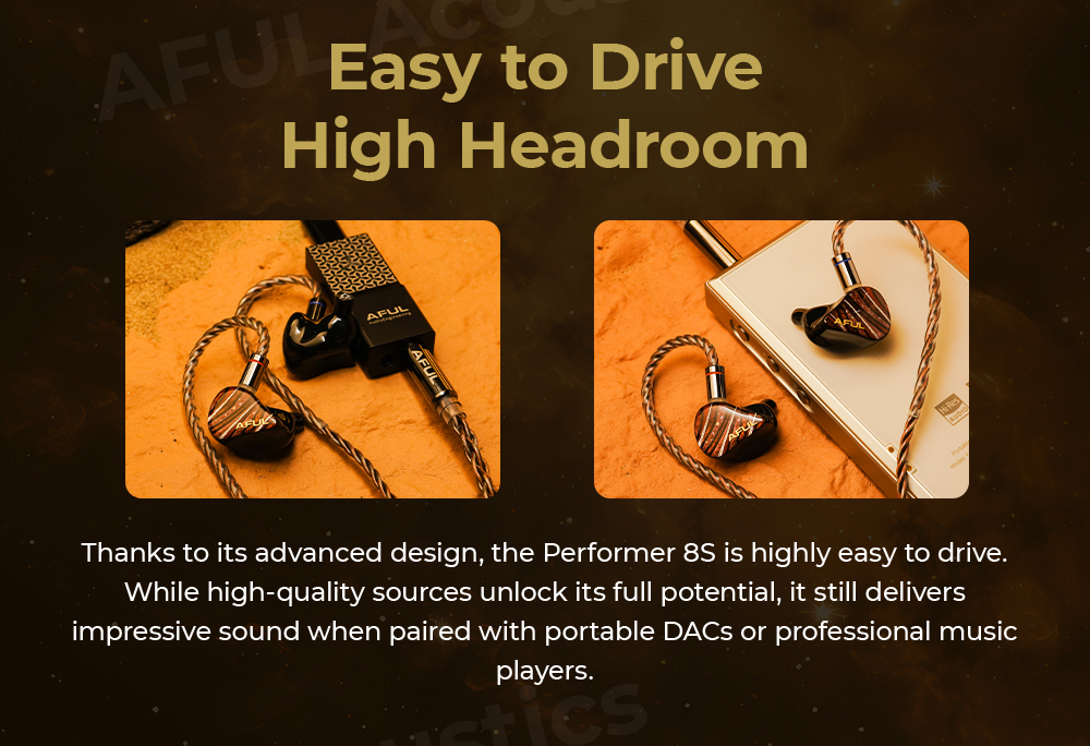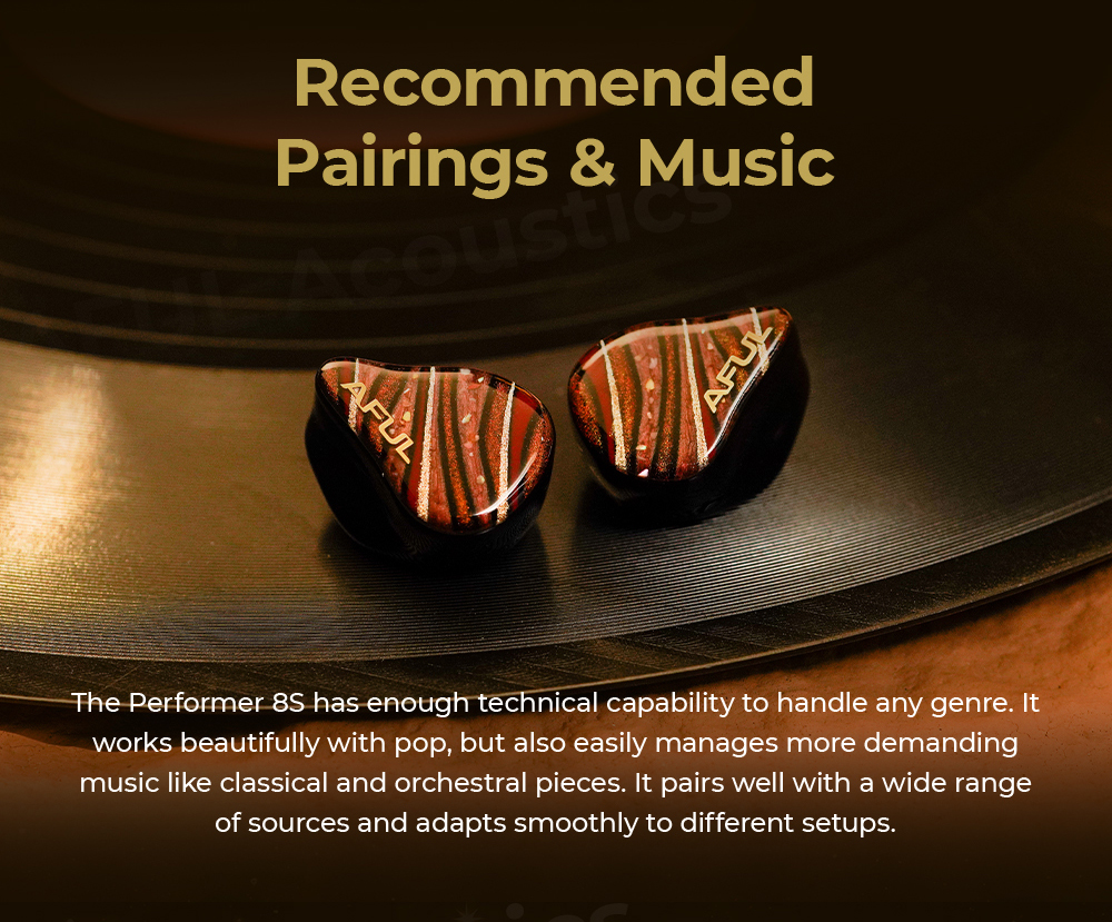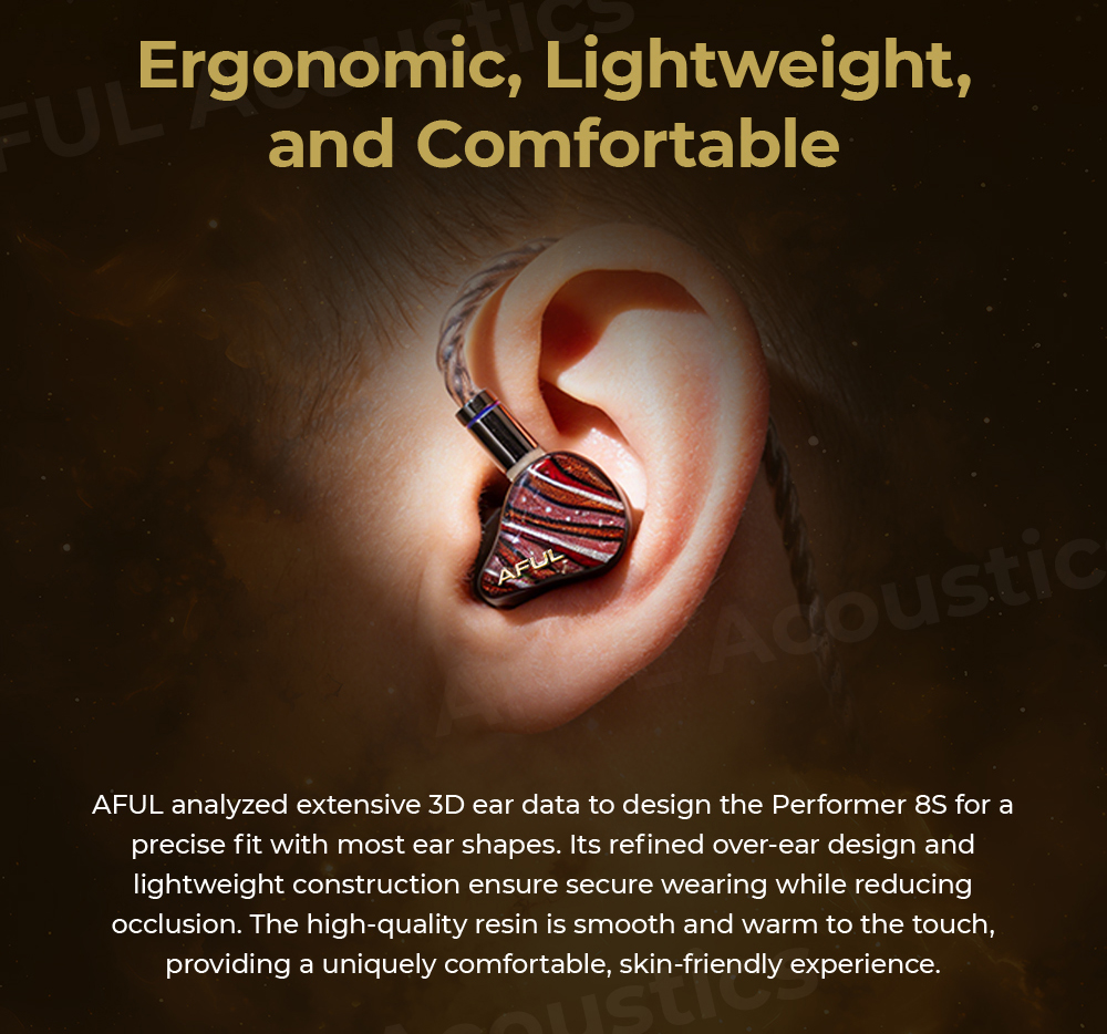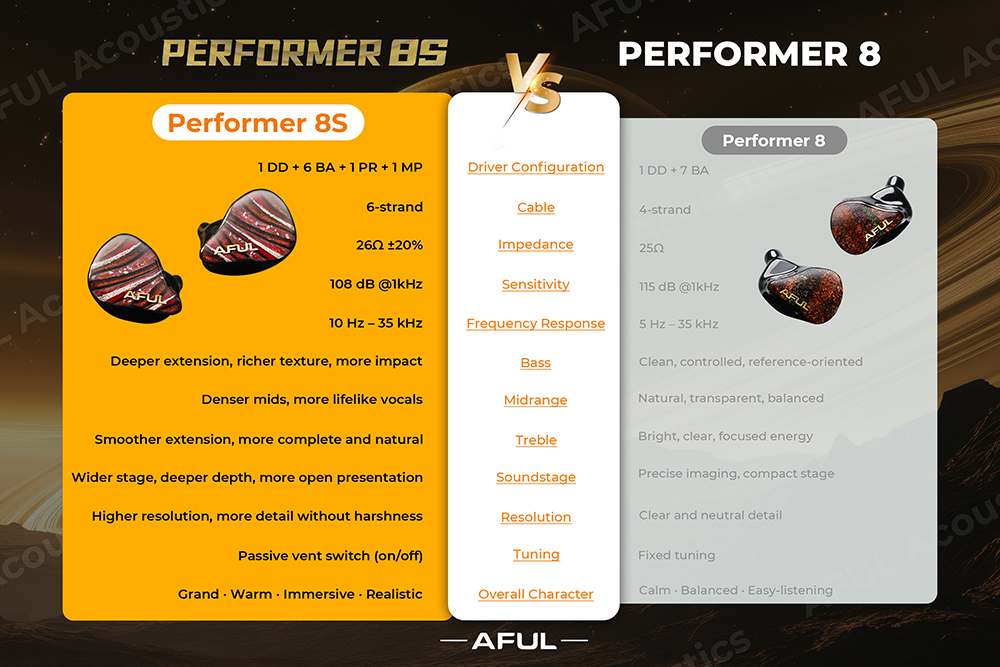 AFUL Performer8S is the new multi-driver hybrid in-ear monitor from the house of AFUL. Designed as an upgrade to the highly-acclaimed Performer 5 and Performer 8, the new Performer 8S brings a complete overhaul with a new quadbrid driver architecture. It houses an astonishing 1DD, 6BA, 1 Passive Radiator, and 1 Micro Planar magnetic driver setup on each side. Inspired by the “Echoes of Jupiter” the Performer 8S has a stunning visual appeal with classy face panels. The Performer 8S combines its sophisticated 9-driver architecture with patented acoustic technologies such as RESInators micro-resonance technology, high-precision 3D-printed acoustic structure, RLC network crossover correction, etc. On top of it all, AFUL Performer 8S has a unique dual-mode bass tuning, the pair features an innovative adjustable passive radiator system where users can opt for the closed mode for a tight, punchy bass, or open mode for a deep and elastic lower-end response. Just like the OG Performer 8, the all-new Performer 8S is all-set to upgrade your portable music listening experience and take it to the next level!!