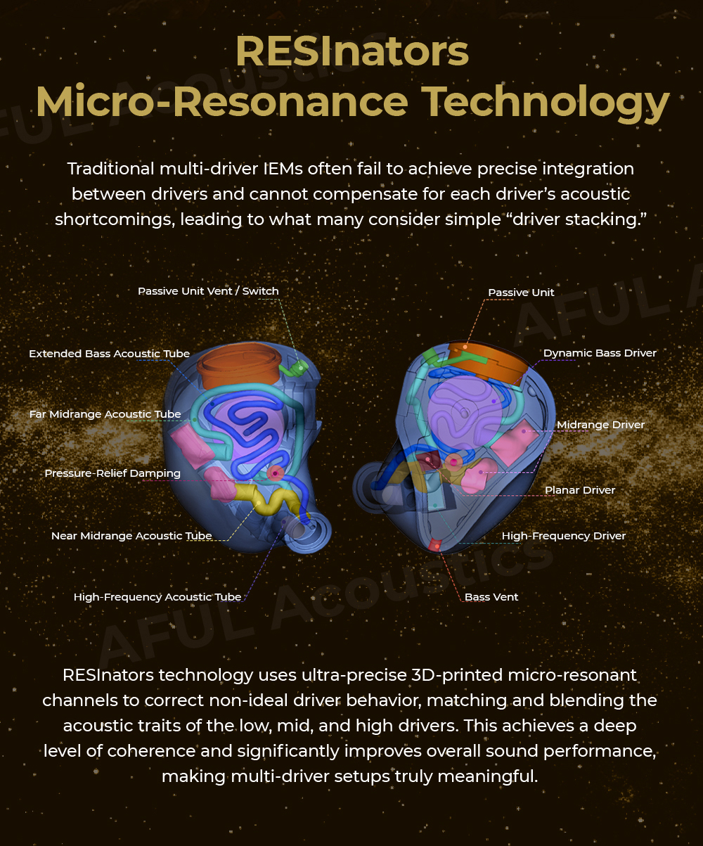 To further enhance the crossover design, AFUL has featured their own RESInators micro-resonance technology on the P8S. This tech uses ultra-precise 3D-printed micro-resonant channels that correct the non-ideal driver behavior and matches their performance across the frequency band ensuring a highly-coherent sound profile. This significantly improves the overall performance of the set, delivering high-resolution clarity across a wide frequency band.