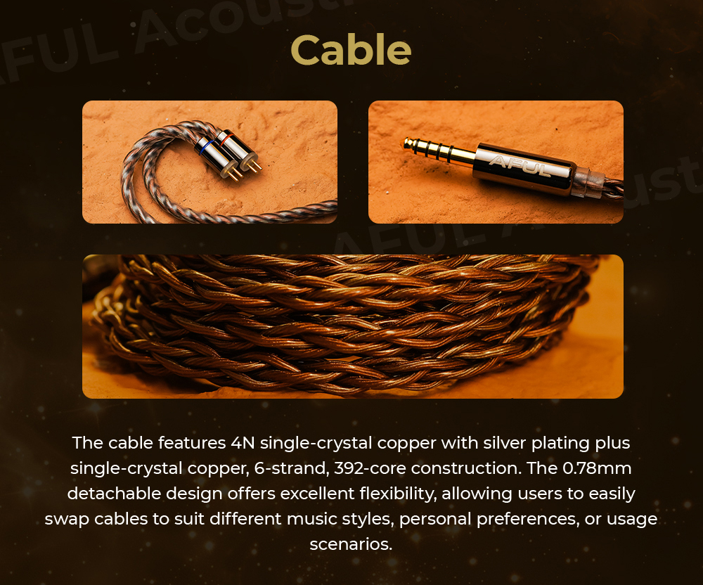 AFUL bundles the Performer8S with a high-purity stock cable. It’s a 6-strand, 392-core cable made up of silver-plated 4N single-crystal Copper and single-crystal copper material wire conductors. The cable features 0.78mm 2-pin connectors and is available in 3.5mm or 4.4mm termination plug options.