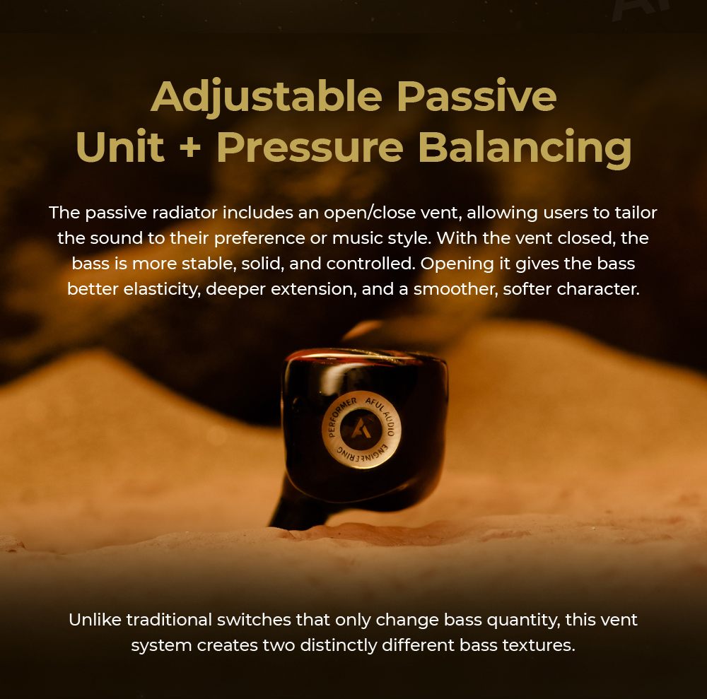 AFUL Performer 8S is a step above the previous IEMs in the Performer series. Instead of a traditional DD+BA arrangement, we have a quad-brid setup here on the P8S. Each side is equipped with 9 drivers including one dynamic driver, six high-performance balanced armature drivers, one micro-planar driver, and a dedicated passive radiator driver. This PR driver has an adjustable design where users can switch between closed and open modes.