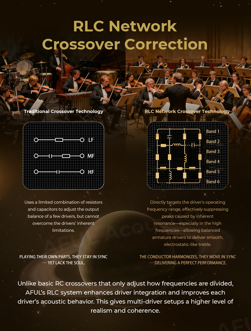 AFUL’s signature RLC(Resistor, Capacitor, Inductor) crossover technology is implemented to get the best out of the 9-driver setup here on the P8S. The crossover is carefully adjusted to refined the 9-drivers perfectly eliminating resonance peaks and ensuring a smooth, detailed, EST-like treble with wide extensions up to 35kHz.